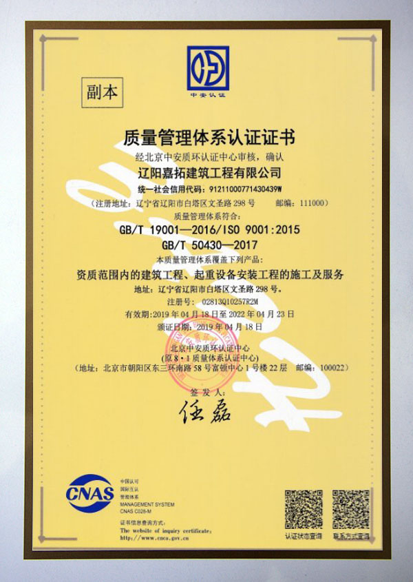 質量管理體系認證證書